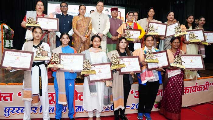 आकाश ज्ञान वाटिका, गुरुवार, 04 सितम्बर 2025, देहरादून। सर्वे चौक स्थित आईआरडीटी सभागार में आयोजित राज्य स्त्री शक्ति, तीलू रौतेली एवं आँगनवाड़ी कार्यकर्ता पुरस्कार वितरण समारोह में मुख्यमंत्री पुष्कर सिंह धामी ने विभिन्न क्षेत्रों में उल्लेखनीय कार्य करने वाली 13 महिलाओं को तीलू रौतेली पुरस्कार और 33 आँगनवाड़ी कार्यकर्तात्रियों को उनके उत्कृष्ट सेवा कार्य के लिए सम्मानित किया।