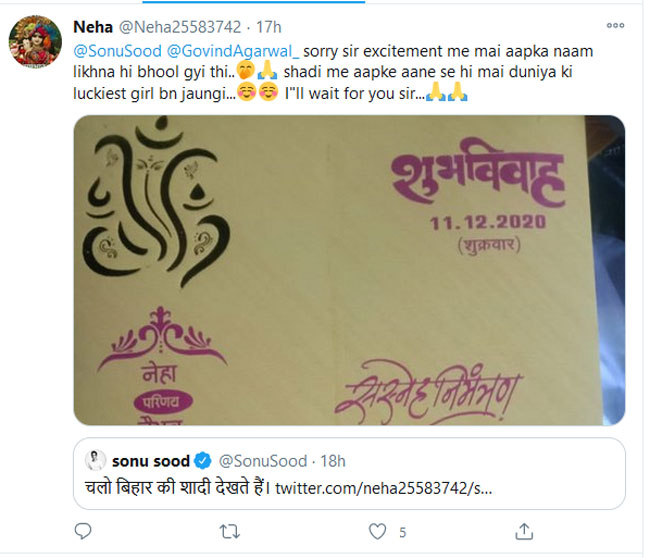 बिहार के भोजपुर जिले के नवादा थाना अंतर्गत करमन टोला की निवासी नेहा ने अपनी शादी में शामिल होने के लिए ट्विटर पर बॉलीवुड स्टार सोनू सूद को आमंत्रण दिया। नेहा ने लिखा कि शादी में उनके आने से वह दुनिया की लुकेस्ट गर्ल बन जाएगी। उसे सोनू सूद के आने का इंतजार रहेगा। नेहा के इस आमंत्रण का सोनू सूद ने भी जवाब दिया। ट्वीट का रिप्लाइ करते हुए सोनू सूद ने लिखा कि चलो बिहार की शादी देखते हैं।