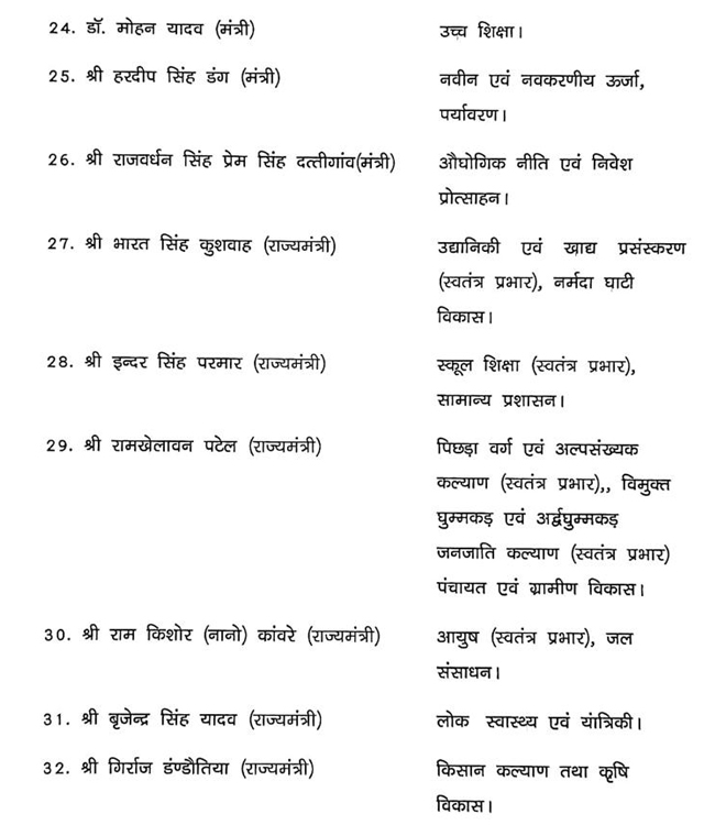 - सीएम शिवराज सिंह चौहान– सामान्य प्रशासन, जनसंपर्क, नर्मदा घाटी विकास, विमानन और ऐसे समस्त विभाग जो किसी अन्य मंत्री को न सौपे गए हों।