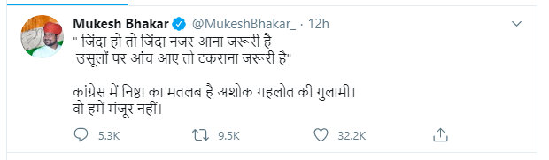 इससे पहले सचिन पायलट के खेमे ने सोमवार को एक वीडियो जारी किया। इस वीडियो में 16 विधायक एक साथ बैठे दिखाई दे रहे हैं। यह वाक्या कांग्रेस विधायक दल की बैठक के कुछ घंटों बाद का है। इस 10 सेकंड के वीडियो को देर रात पायलट के आधिकारिक व्हाट्सएप ग्रुप पर शेयर किया गया। समाचार एजेंसी पीटीआइ के अनुसार वीडियो में, कम से कम 16 विधायक एक साथ बैठे दिखाई दे रहे हैं। हालांकि, वीडियो में पायलट नजर नहीं आ रहे है। वीडियो में छह अन्य लोगों को देखा जा सकता है, लेकिन उनकी पहचान नहीं हो सकी है। वीडियो में दिख रहे कुछ विधायकों में इंद्रराज गुर्जर, मुकेश भाकर, हरीश मीणा हैं। पर्यटन मंत्री विश्वेंद्र सिंह ने वीडियो को कैप्शन के साथ ‘परिवार’ के साथ ट्वीट किया। वहीं लाडनू से विधायक मुकेश भाकर ने ट्वीट कर कहा, ‘कांग्रेस में निष्ठा का मतलब अशोक गहलोत की गुलामी है। यह हमें स्वीकार्य नहीं है।’