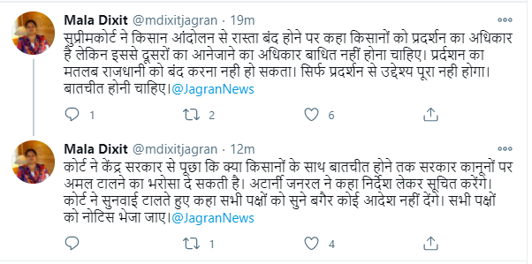 इससे पहले बुधवार को सुनवाई के दौरान किसान और सरकार में विवाद सुलझाने के लिए शीर्ष अदालत ने कमेटी गठित करने का संकेत दिया। कमेटी में सरकार और किसान संगठनों के प्रतिनिधि शामिल होंगे। अदालत ने इस संबंध में केंद्र, हरियाणा व पंजाब सरकारों एवं किसान संगठनों को नोटिस जारी कर संबंधित पक्षों से एक दिन में जवाब देने को कहा था। प्रधान न्यायाधीश एसए बोबडे की अध्यक्षता वाली तीन सदस्यीय पीठ ने रिषभ शर्मा, रीपक कंसल और जीएस मणि की याचिकाओं पर सुनवाई की। इस मामले में कोर्ट ने आठ किसान संगठनों को भी पक्षकार बनाते हुए नोटिस जारी किया।