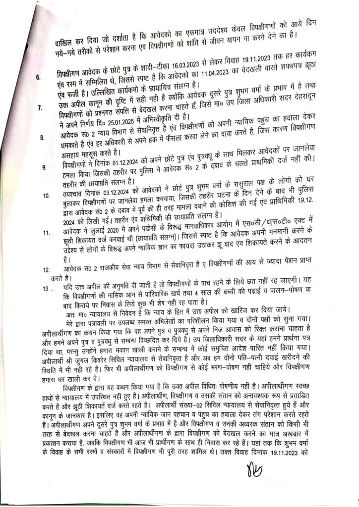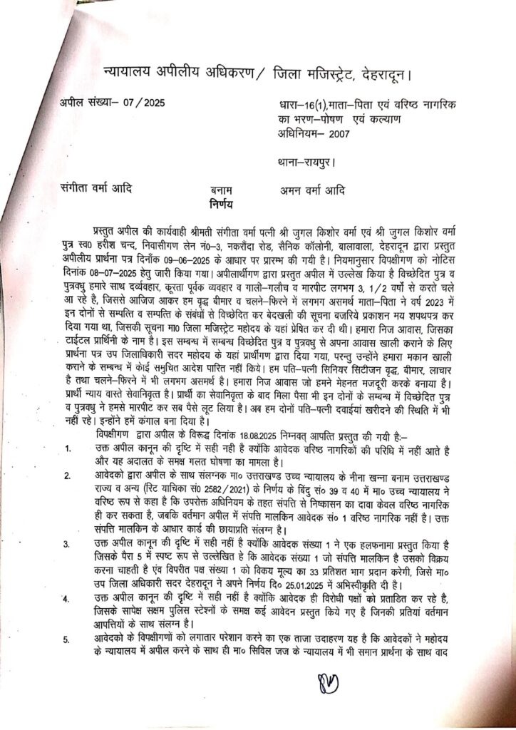 आकाश ज्ञान वाटिका, बुधवार, 20 अगस्त 2025, देहरादून। जिलाधिकारी जनता दर्शन में राजपत्रित पिता जो चलने फिरने में समथ है फिर भी व्हीलचेयर पर आकर डीएम से गुहार लगाई थी कि उनका बेटा बहु उनसे मारपीट करते हैं, उन्होंने भरण पोषण अधिनियम में वाद दाखिल कराने का अनुरोध किया, जिस पर डीएम कोर्ट में वाद दाखिल किया तथा फास्ट्रेक सुनवाई की गई। पिता द्वारा अपने ही पुत्र, पुत्रवधु व 4 वर्षीय नौनिहाल पर भरण पोषण अधिनियम में वाद दायर कर दिया। जिला मजिस्ट्रेट ने दोनों पक्षों को सुना तथा दोनों पक्षों द्वारा प्रस्तुत किए गए सबूत की जाँच करने पर पाया कि पिता चल-फिर सकने में सक्षम है तथा माता-पिता कुल 55 हजार आय अर्जित करते हैं तथा अपने अल्पवेतनभोगी लाचार बेटे के परिवार को निजी स्वार्थ के चलते झूठा वाद दायर घर से बेघर करना चाहता है।