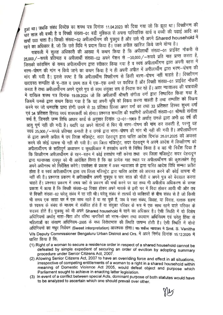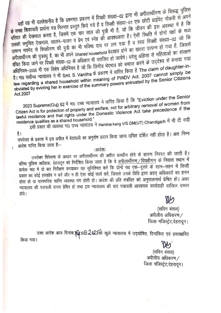 अमन वर्मा एक छोटी प्राईवेट नौकरी से अपने परिवार की देखभाल करता है, जिसमें एक चार साल की पुत्री भी है, जो कि जीवन की इस अवस्था में है कि उसको समुचित देखभाल, लालन-पालन व प्रेम एवं स्नेह की आवश्यकता है। ऐसी स्थिति में दोनों पक्षों के मध्य उत्पन्न मतभेद से विपक्षीगण की 4 वर्षीय पुत्री का भी भविष्य दाव पर लग गया है व मीनाक्षी जो कि अपीलार्थीगण की पुत्रवधु है, का भी अपने Shared household बेदखल होने का खतरा उत्पन्न हो गया है, जिससे वंचित किया जाने पर उनके के अधिकार भी पराजित हो जायेंगे। विवेचना के आधार पर जिला मजिस्ट्रेट ने फैसला सुनाते हुए अपीलार्थीगण की अपील बलहीन होने के कारण निरस्त की जाती है। वरिष्ठ पुलिस अधीक्षक, देहरादून को भी निर्देशित किया गया है कि वे अपीलार्थीगण/विपक्षीगण के निवास स्थान में प्रत्येक माह में दो बार निरीक्षण करवाकर यह सुनिश्चित करें कि दोनों पक्ष एक-दूसरे के रहन-सहन में किसी प्रकार का कोई हस्तक्षेप न करें और न ही ऐसा कोई कार्य करें, जिससे उनके विधि द्वारा प्रदत् अधिकारों का हनन होता हो या पारस्परिक शांन्ति व्यवस्था भंग होती हो। आदेश की प्रति संबंधित को अनुपालनार्थ प्रेषित हो। अवर न्यायालय की पत्रावली वापस प्रेषित हो तथा इस न्यायालय की वाद पत्रावली आवश्यक कार्यवाही दाखिल दफ्तर होवे।