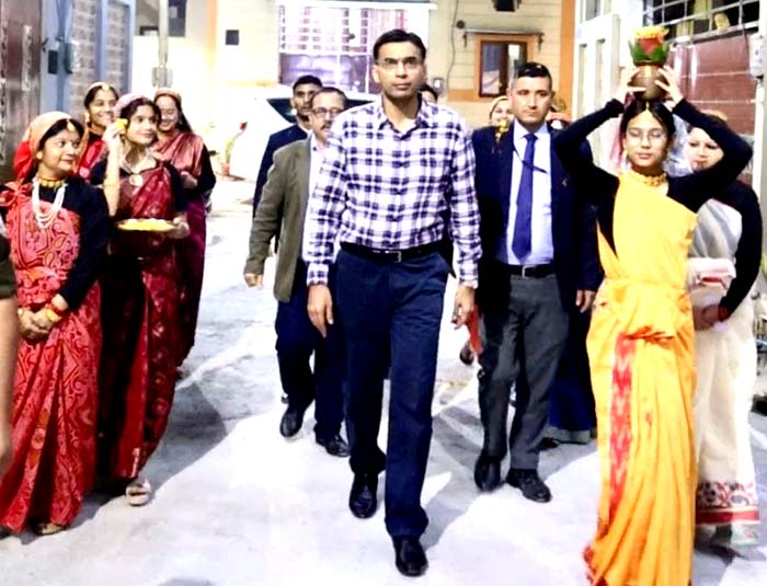 आकाश ज्ञान वाटिका, गुरुवार, 5 नवंबर,2025, देहरादून। जिलाधिकारी सविन बंसल कल देर शाम गंगोत्री एंक्लेव रेजिडेंट वेलफेयर सोसाइटी की महिलाओं द्वारा उन्हें ‘रियल हीरो’ सम्मान दिया गया। जिलाधिकारी को लोक पर्व ईगास पर्व अवसर पर गंगोत्री एन्कलेव निवासियों द्वारा आमंत्रित किया गया था। जहाँ महिलाओं, बालिकाओं ने जिलाधिकारी हल्दी, चंदन, रोली से टीका अक्षत लगाकर स्वागत किया।