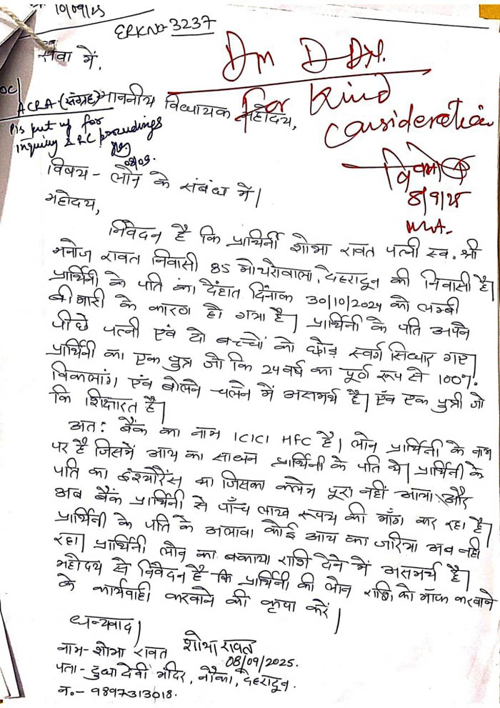 जिलाधिकारी कार्यालय कक्ष कलेक्ट्रेट में विधवा शोभा ने जिलाधिकारी से मिलकर गुहार लगाई कि उसके पति की मृत्यु वर्ष 2024 में हो गई थी। शोभा रावत पत्नी स्व० मनोज रावत ने जिलाधिकारी के समक्ष प्रस्तुत होकर गुहार लगाई कि उन्होंने आईसीआईसीआई बैंक शाखा से रूपये 10,00,000/- तथा रूपये 7,00,000/- कुल रूपये 17,00,000/- का लोन लिया था। शोभा केे पति मनोज रावत की मृत्यु 30 अक्टूबर 2024 को हो गयी थी। दो बच्चे जिनमें एक बिटिया पढाई करती है तथा बेटा 100 प्रतिशत् दिव्यांग है। बैंक द्वारा पति की मृत्यु के उपरांत इंश्योरेंस की क्लेम कुल रूपये 13,20,662/- की धनराशि को लोन की धनराशि में समायोजित किया गया तथा लगभग रूपये 5,00,000/- की धनराशि जमा की जानी अवशेष है।