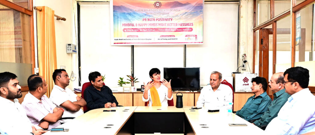 आकाश ज्ञान वाटिका, शनिवार, 10 मई 2025, देहरादून। पब्लिक रिलेशन्स सोसाइटी ऑफ इंडिया (PRSI), देहरादून चैप्टर द्वारा “सकारात्मक सोच और सजग मन : प्रभावी जनसंपर्क का मूल मंत्र” विषय पर एक प्रेरणादायक सत्र का आयोजन किया गया। यह आयोजन हडको कार्यालय, राजपुर रोड में हडको और आर्ट ऑफ लिविंग के सहयोग से संपन्न हुआ।